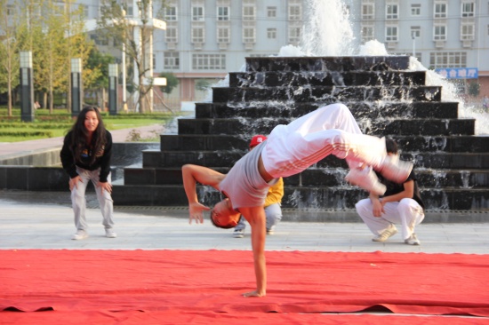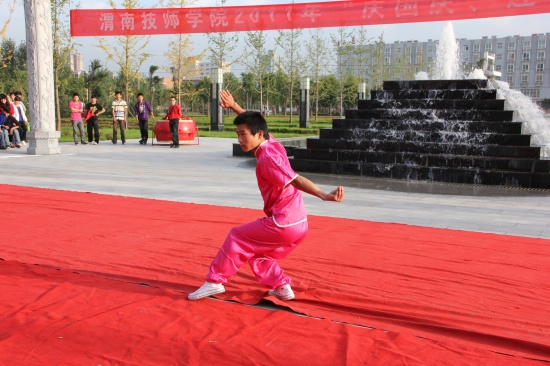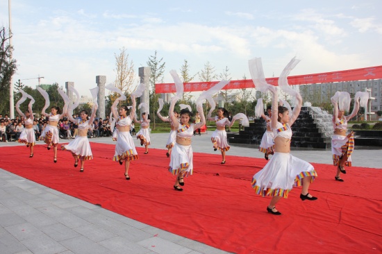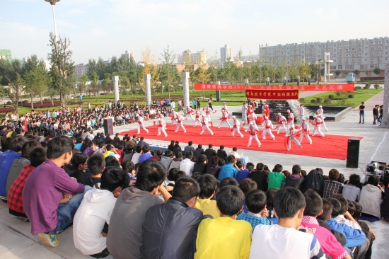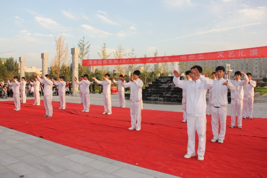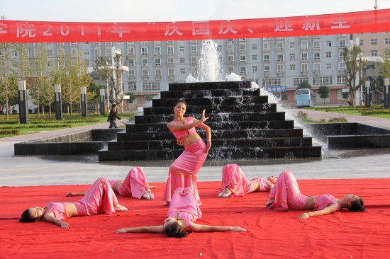 院党委副书记李东旺致开幕词 汇演在铿锵激昂的陕北腰鼓《喜庆》中盛装开幕。腰鼓队员们抖动的红绸像艳丽的火炬,雄浑的鼓点,击出了昂扬的风貌、粗犷的舞姿、蓬勃的生命,让在场所有师生的激情在心中奔涌成河!独唱《多情的土地》、《我是一只小小鸟》、《Nothing's gona change my love for you》及组合唱《扯》亦或唯美悦耳、亦或宛转悠扬、亦或活力四射,以极强的感染力和震撼力吸引了广大师生;街舞《舞动奇迹》动感十足、激情飞扬;手语表演《从头再来》整齐划一、意境深远;花样跳绳姿态翩跹,武术表演刚柔并济、豪迈有力,滑轮表演《穿梭》引领炫酷风暴,精彩绝伦;诗歌朗诵《中国梦》、《祖国,我为你自豪》、《我的祖国》,独唱《精忠报国》,舞蹈《吉祥谣》、《春晓》、《神奇的九寨》热情讴歌了在党的正确领导下中国正朝着复兴的道路阔步前进,表达了全院师生对伟大祖国的深情祝福和由衷赞美,展示了学院学子斗志昂扬、奋发有为、蓬勃向上的良好精神风貌。舞蹈《祖国万岁》将这场演出推向高潮,为整场演出划上了圆满的句号。