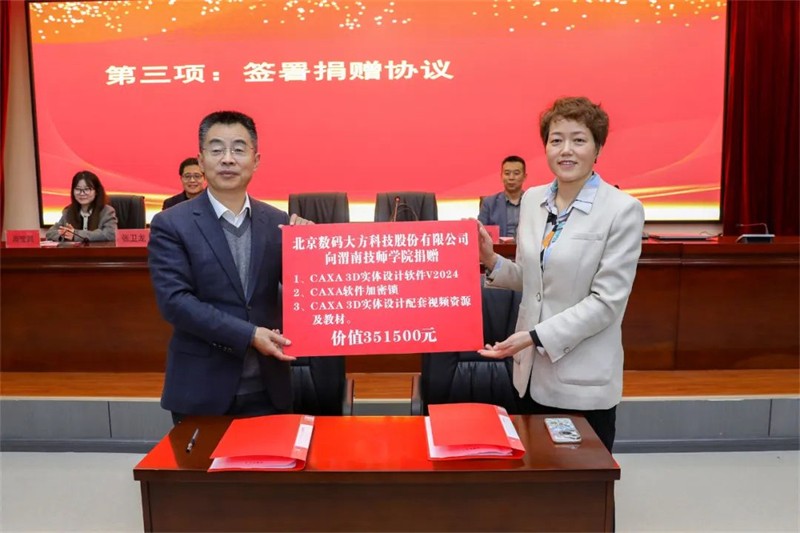 会上,北京数码大方科技有限公司向我院捐赠CAXA 3D实体设计软件1套、CAXA软件加密锁20个、价值351500元的配套视频教学资源及教材1套。