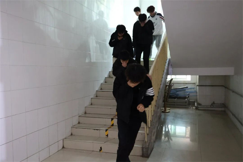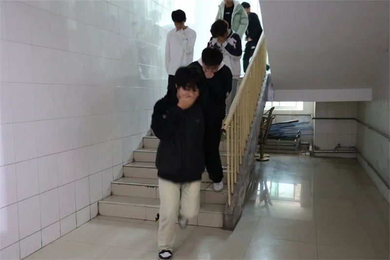 随着警报声响起,活动正式开始。班主任和教官迅速反应,引导学生们捂住口鼻,低姿弯腰沿着疏散路线快速有序地向安全区域撤离。同学们在演练活动中不慌不乱,听从指挥,紧张有序,展现出了良好的组织纪律性和应对紧急突发事件的能力。