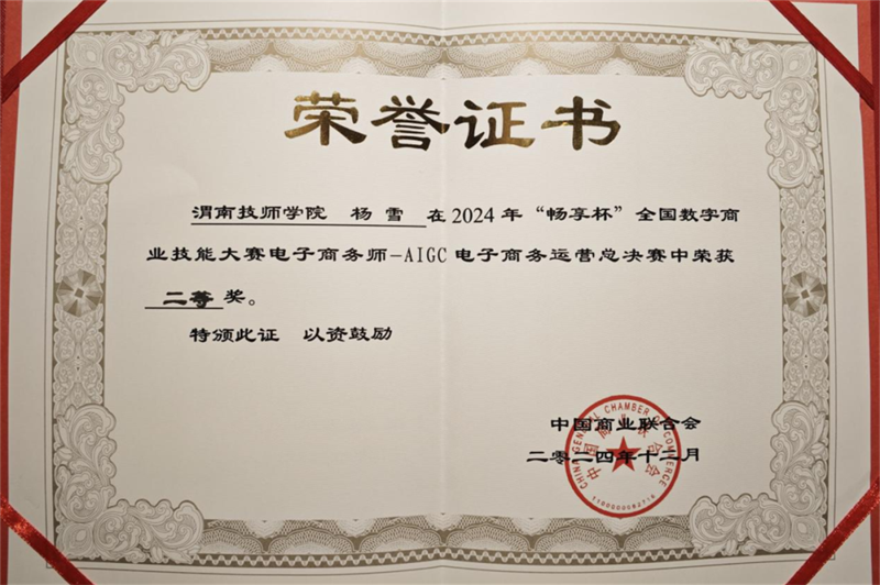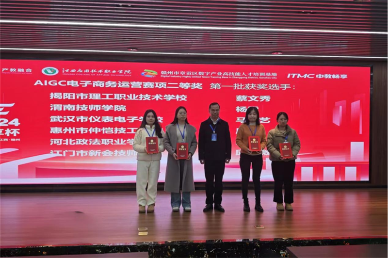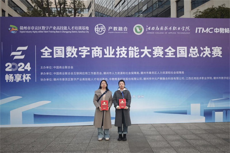 由中国商业联合会主办、中国商业联合会互联网应用工作委员会等单位承办的2024年“畅享杯”全国数字商业技能大赛电子商务师-AIGC电子商务运营总决赛于12月17日-19日在江西省赣州市章贡区数字产业高技能人才培训基地进行。来自全国17个省市的81个中高职院校的教师队伍参赛。经过激烈角逐,我院电信工程系专业课教师孙苗、杨雪经过预赛闯入全国总决赛,分别荣获一等奖、二等奖。