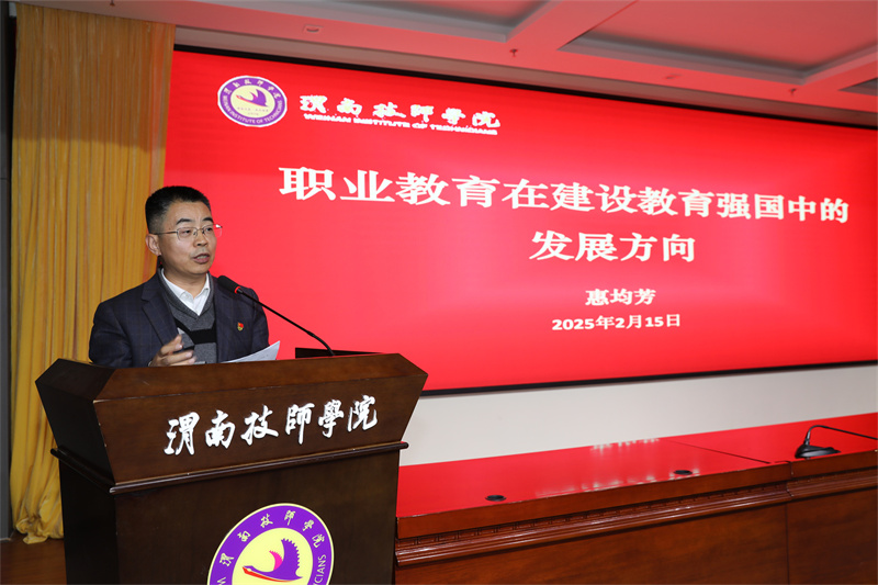 2月15日,陕西省教育科学研究院副院长惠均芳应邀莅临我院作题为《职业教育在建设教育强国中的发展方向》的专题讲座,学院党委书记曲志勇、领导班子成员、副科以上干部及全体教师参加此次讲座。讲座由党委副书记、院长张君升主持。