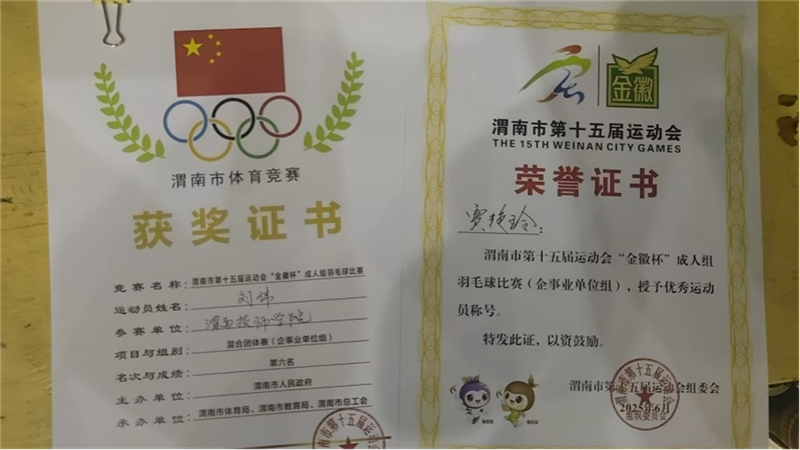在刚刚落下帷幕的渭南市第十五届运动会羽毛球比赛中,我院教工羽毛球队获佳绩,在本次比赛中名列团体第六名,教职工贾艳玲荣获“优秀运动员”称号,展现出我院教职工团结协作、昂扬向上的精神风貌。