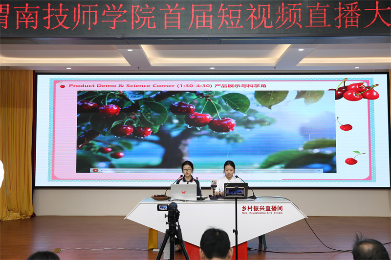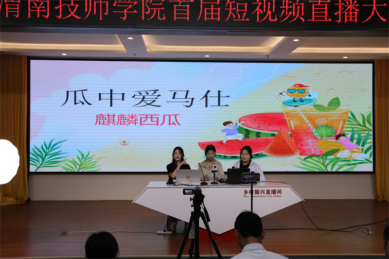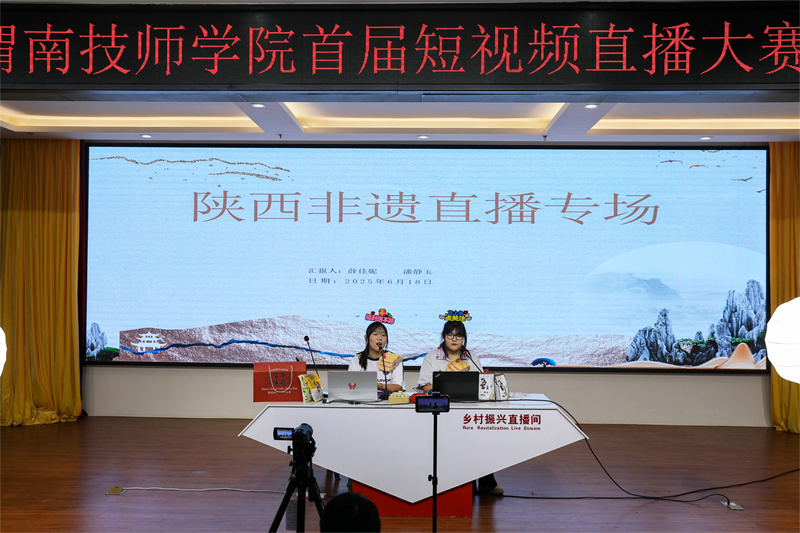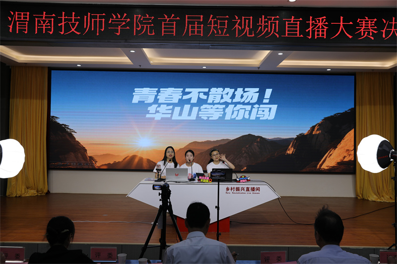 \为进一步深化产教融合,创新人才培养模式,激发青年学子拥抱数字经济浪潮的热情与创造力,6月18日,渭南技师学院首届短视频直播大赛在产教融合二楼报告厅成功举办。 大赛特别邀请了渭南市商务局商改办副主任张建新,渭南师范学院经济管理学院教授韩宏刚参加。院领导班子成员及各系处负责人莅临现场,电信工程系全体教职工、电商专业学生到场观看。