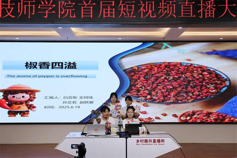 大赛以“技炫青春,直播未来”为主题,吸引了全院师生踊跃参与,经过初赛激烈角逐,11支优秀团队脱颖而出,在决赛现场精彩展示了优秀的短视频创作能力和形式多样的直播技巧。现场气氛热烈,直播间实时互动火热,选手们精神饱满,在镜头前或娓娓道来产品背后的文化故事,或激情互动展示营销话术,或沉着应对模拟突发状况,娴熟运用镜头语言、直播技巧、后台操作及数据分析能力。师生同台竞技成为亮点,教师组的专业示范与学生组的青春活力交相辉映,特别是师生同组的合作,充分体现了教学相长的育人理念。