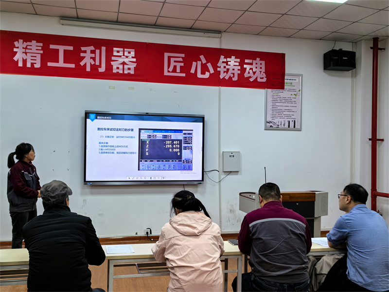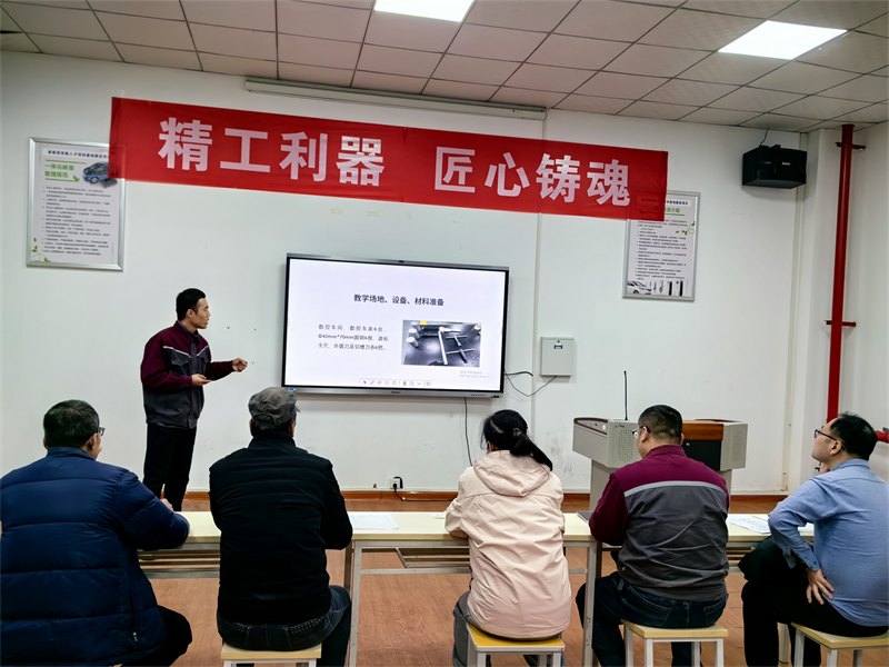 五位老师紧扣专业核心技能点与职业素养培养目标,依次完成15分钟微型课展示,内容紧密对接岗位实际,体现“岗课赛证”融合的教学理念。周瑜老师讲解了“车削外圆及端面”的关键步骤与操作要领,将传统车床加工的精度与技巧生动呈现;宜渭峰老师针对“数控车G00、G01指令”,系统阐释了快速定位与直线插补的功能应用与实际编程案例;张海军老师带来的“数控铣对刀操作”,重点突出了对刀精度对于加工质量的决定性影响;贾艳玲老师同样围绕“数控车对刀操作”,从另一视角展示了其严谨的操作流程与常见问题解决方法;曹西安老师对“G41、G42半径补偿指令”进行了深入解析,破解了学生在程序编制中的难点。五位教师风格各异却同样精彩,展现了实训教师 “懂技术、善教学、精指导”的专业素养,彰显了新时代实训教学的创新活力。