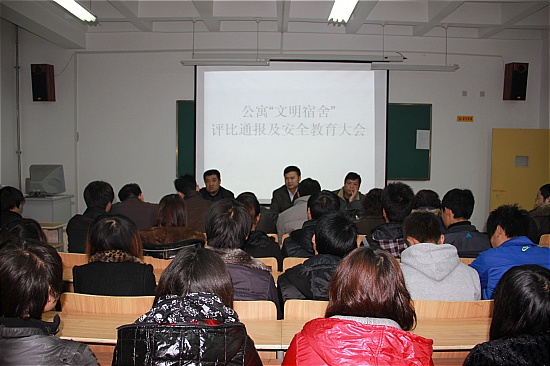 为进一步推动“平安校园”创建工作,学生处公寓管理科组织各系管理教师和各舍长召开了“文明宿舍”评比通报及安全教育会议,就文明宿舍评比、创建平安校园、冬季公寓安全排查工作进行了总结和安排,并对各宿舍管理人员职责提出了具体要求。院长曲志勇在肯定成绩的同时提出了三点要求,要以创建“平安校园”为契机,做好今后公寓管理和学生养成教育工作;要注意冬季“三防”安全问题,杜绝不安全事故的发生;要求学生进一步增强主人翁观念和集体意识,敢于监督、检举破环公物的不良行为。