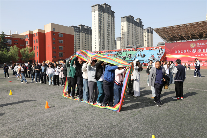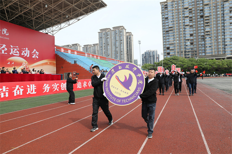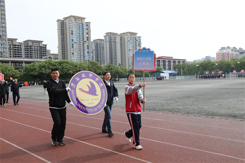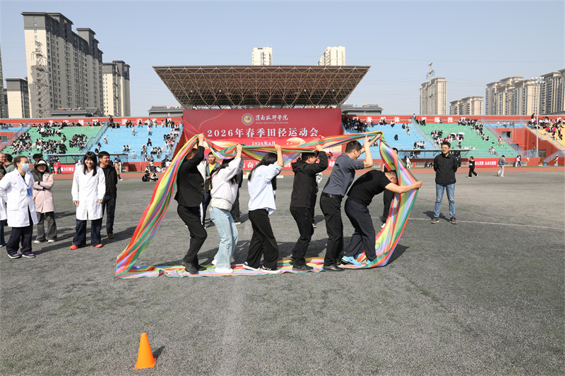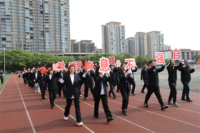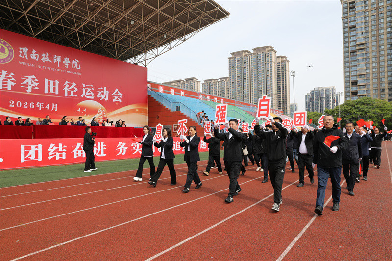 春风和畅,万象更新。4月22日至24日,渭南技师学院2026年教职工趣味运动会在学校运动场活力启幕。本次运动会以“运动凝聚人心 活力赋能发展”为主题,由院工会精心策划组织,旨在通过趣味运动增进交流、凝聚合力,营造健康向上的校园文化氛围。 开幕式在激昂的《运动员进行曲》中拉开帷幕,由百名教职工代表组成的方阵率先入场,成为全场焦点。方阵成员身着统一服装,精神抖擞,步伐铿锵有力,在国旗与院旗的引领下整齐行进。队列严整,口号嘹亮,行进间队形始终保持整齐划一,充分展现了学院教职工高度的纪律性、卓越的团队凝聚力和昂扬奋进的精神风貌,赢得了现场师生的阵阵掌声,为运动会绘就了亮丽的开篇。