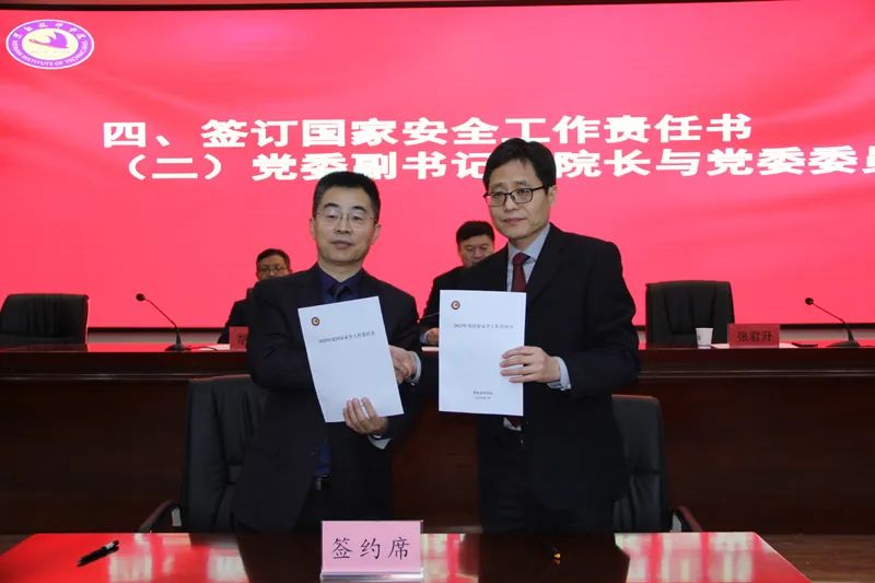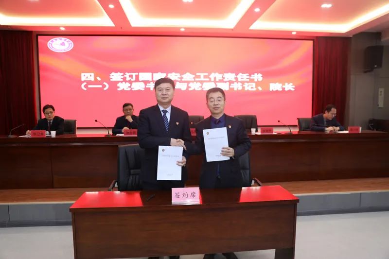 会议对2023年学院国家安全工作进行了全面部署,党委书记曲志勇与党委副书记、院长张君升签订了《2023年国家安全工作责任书》。随后,张君升分别与院领导班子成员、各部门负责人分别签订了安全责任书。党委委员、副院长胡忠民领学了《贯彻总体国家安全观“十个坚持”》和《国家安全教育日相关知识》;党委委员、纪委书记蔡小伦宣读了《中共渭南技师学院委员会关于调整国家安全工作机构人员的通知》;党委委员、副院长张卫龙宣读了责任书内容。